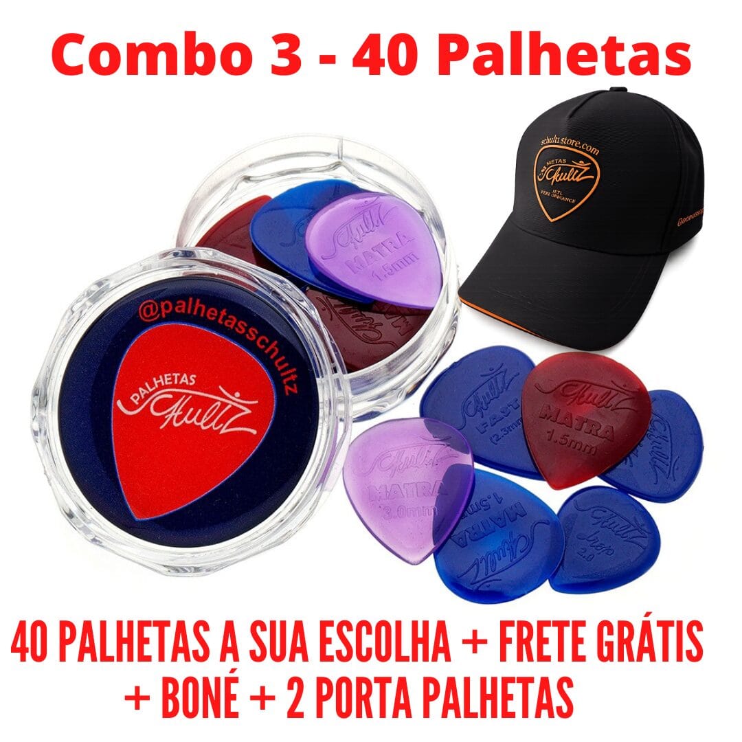 Combo 3 – 40 Palhetas a sua escolha + Boné + 2 Porta‑Palhetas + Frete Grátis (20% de desconto) *As cores das palhetas podem variar de acordo com a disponibilidade em estoque.